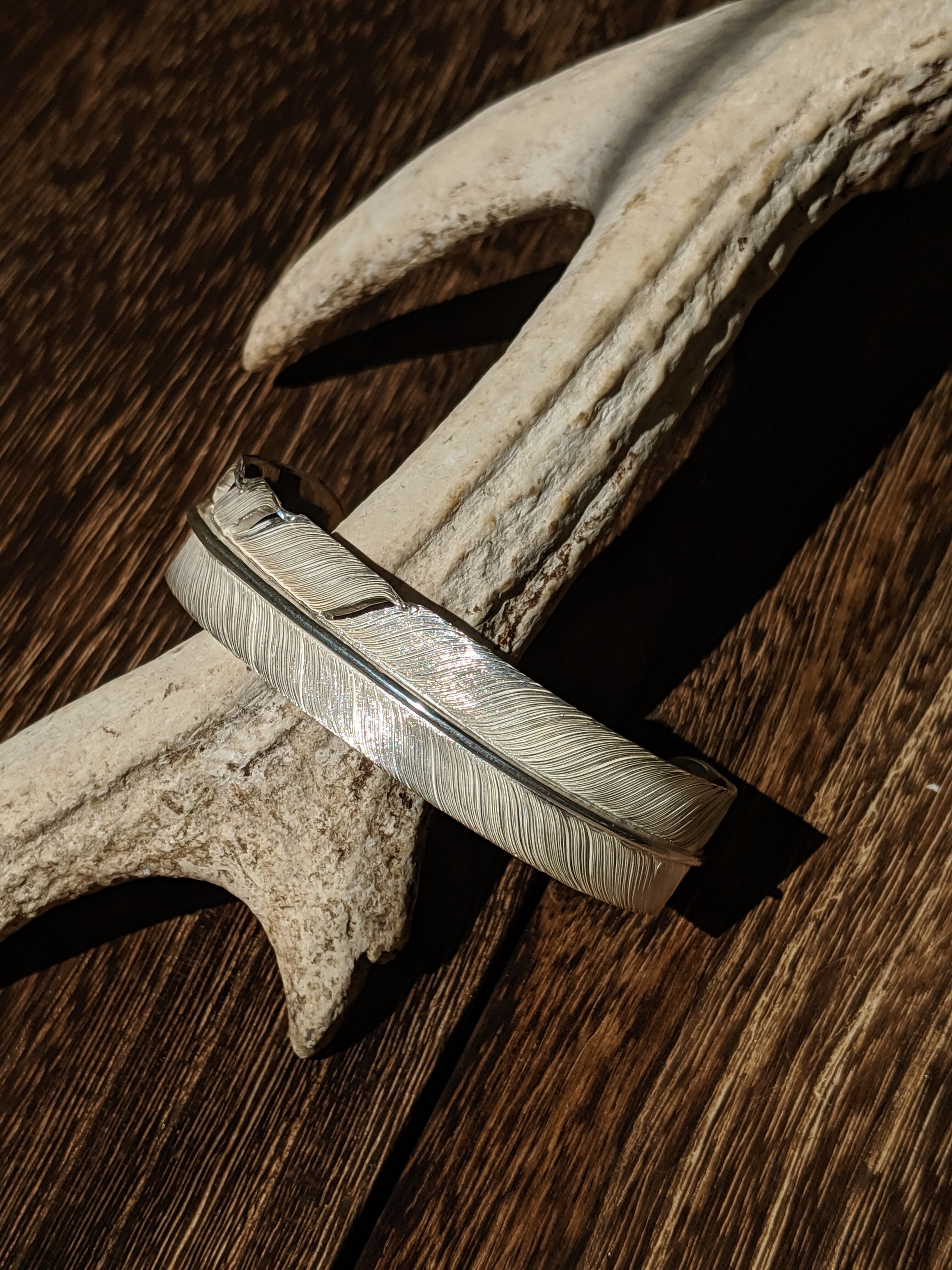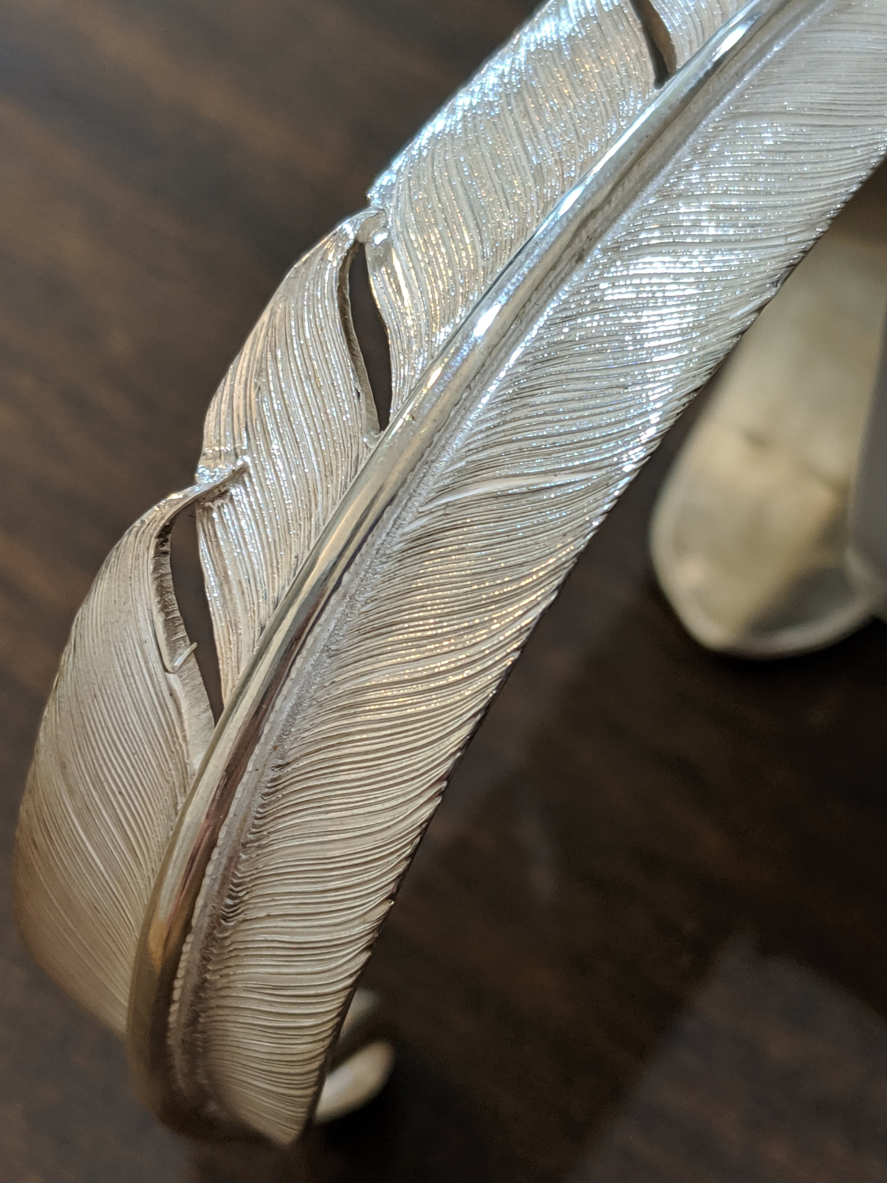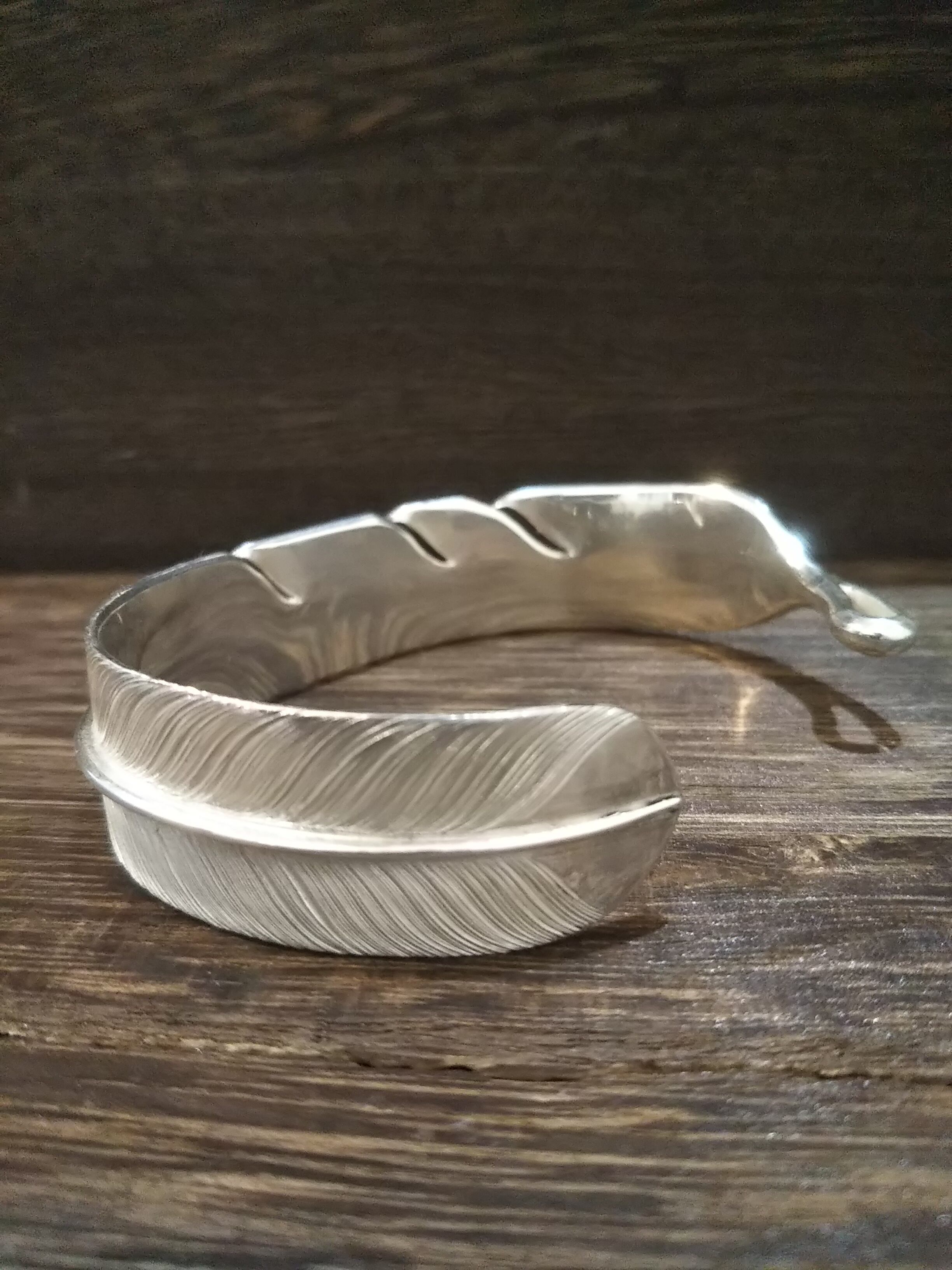銀の板から切り出して、1本1本線を細かく彫り込んだこだわりのフェザーバングルです。